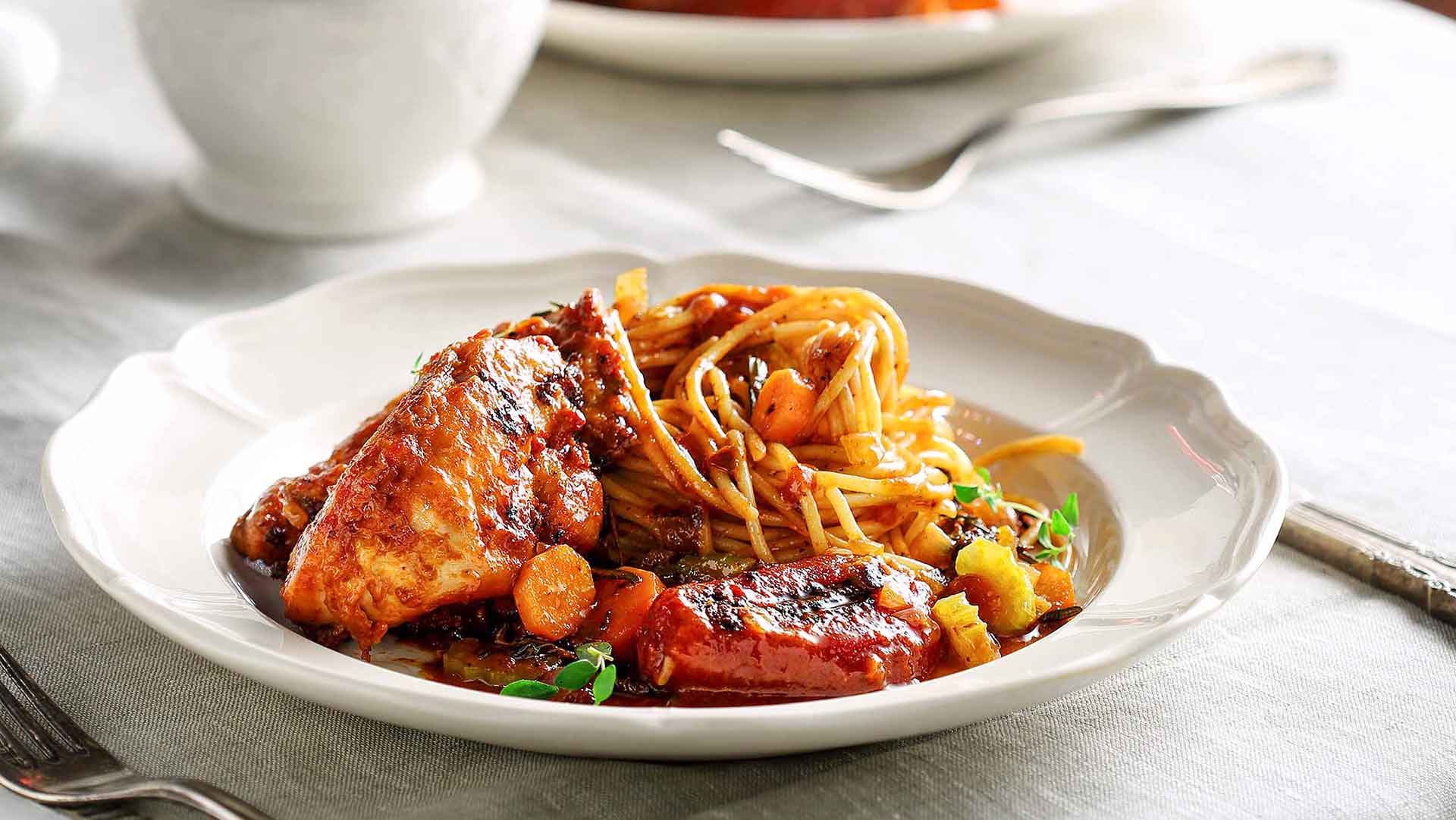 Βράζουμε σε μέτρια φωτιά την μακαρονάδα μέσα στη σάλτσα της κότας.
