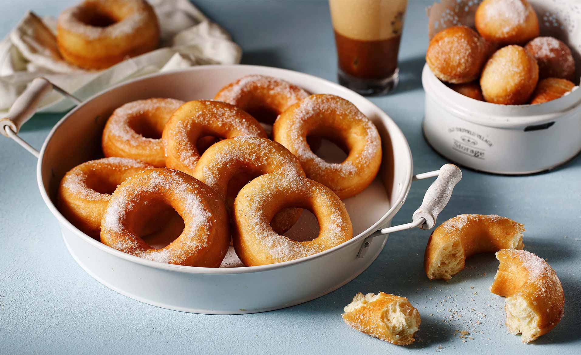 Μόλις τους βγάζουμε, καυτοί όπως είναι τους βουτάμε στην κρυσταλλική ζάχαρη για να κολλήσει πάνω τους.